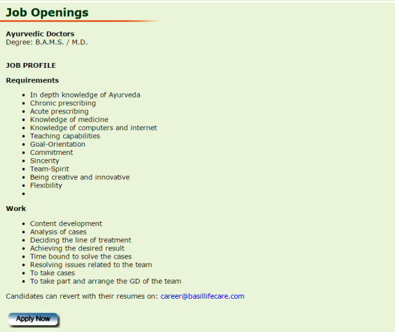Vacancy for the post of Ayurvedic Doctors Basil Lifecare Pvt. Ltd.