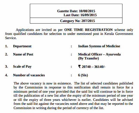 Vacancy for the post of Medical Officer Kerala Public Service Commission.