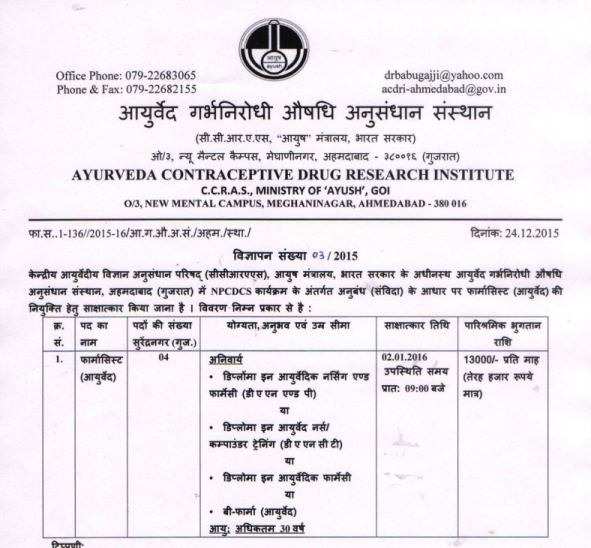 Walk in interview for the post of Pharmist(Ayurveda) at CDRI, Ahmedabad.