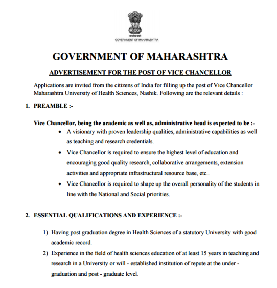 Vacancy for the post of Vice Chancellor at Maharashtra University of Health Sciences, Nashik.
