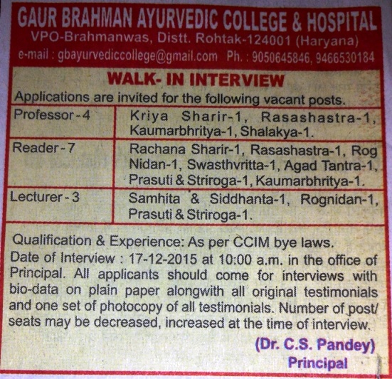 Walk in interview for the post of Professor and Lecturer at Gaur Brahman Ayurvedic College, Haryana.