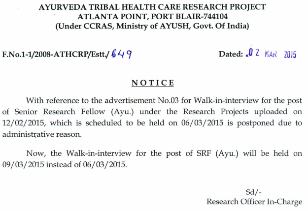 Rescheduled date of Walk-in-Interview for the post of SRF (Ayurveda) under, Ayurveda Tribal Health Care Research Project (ATHCRP), Port Blair.