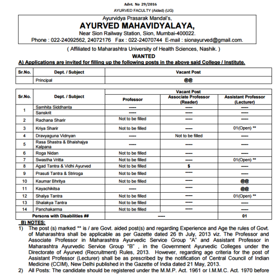 Vacancy for the post of Ayurved Faculty at Ayurvidya Prasarak Mandal, Mumbai.