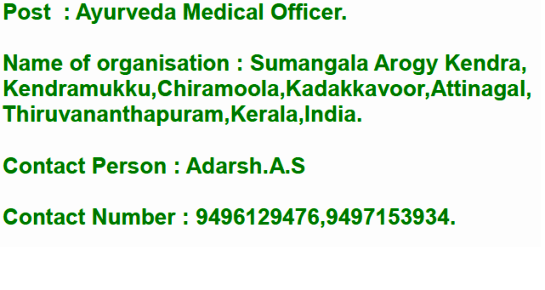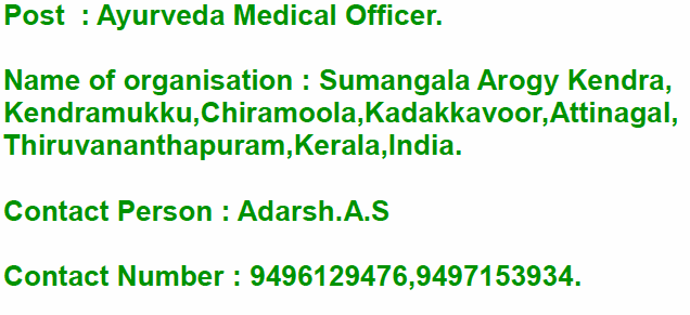 Vacancy for the post of Ayurveda Medical Officer at Sumangala Arogy Kendra, Kerala.
