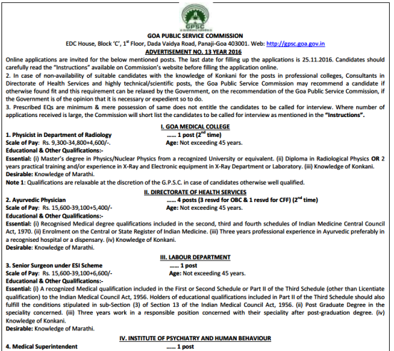 Vacancy for the post of Ayurvedic Physician at Goa Public Service Commission.