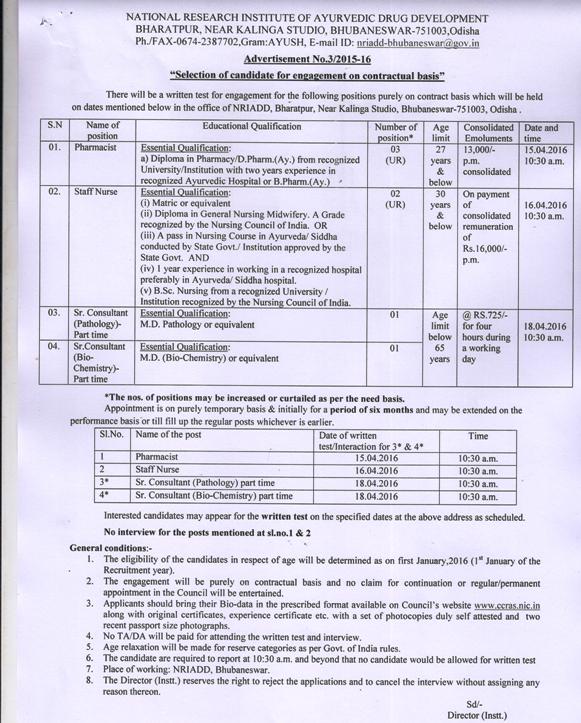 Walk in interview for the post of Pharmacist at NRIADD, Bhubaneswar.