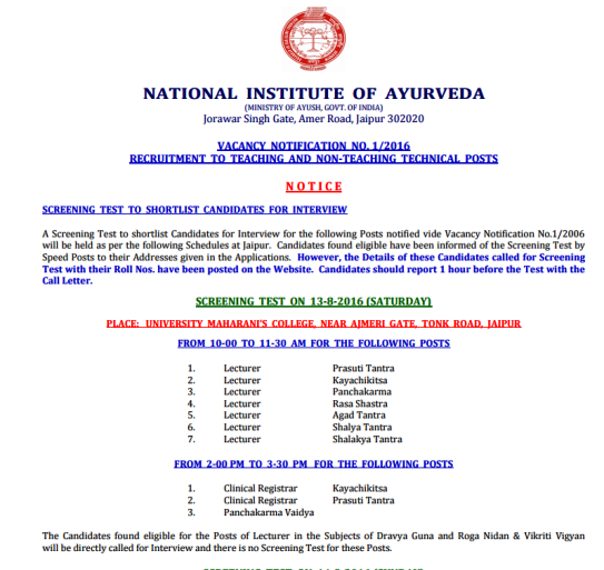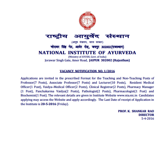 Vacancy for the post of Teaching and Non-Teaching Faculty at National Institute Of Ayurveda, Jaipur.