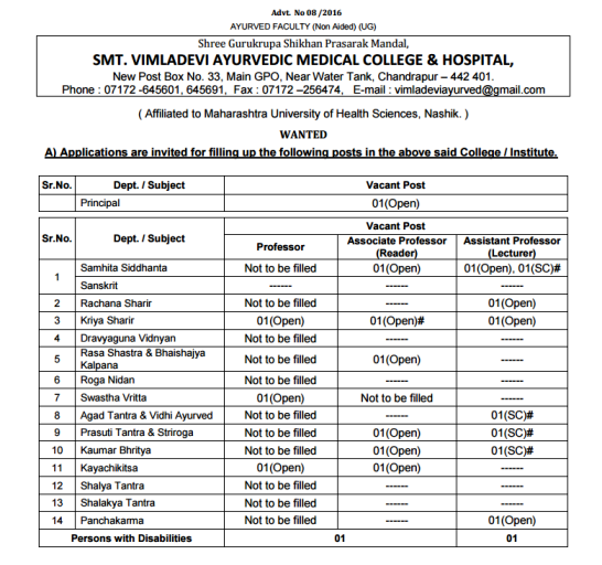 Vacancy for the post of Ayurved Faculty at Smt.Vimladevi Ayurvedic Medical College & Hospital, Chandrapur.
