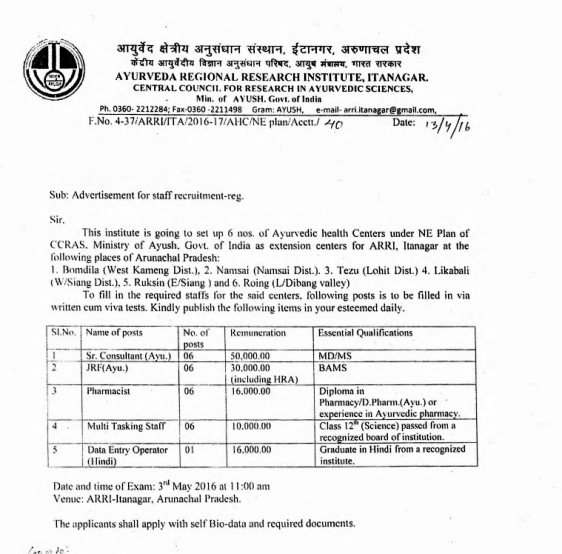 Vacancy for Various Posts at Ayurveda Regional Research Institute, Itanagar.