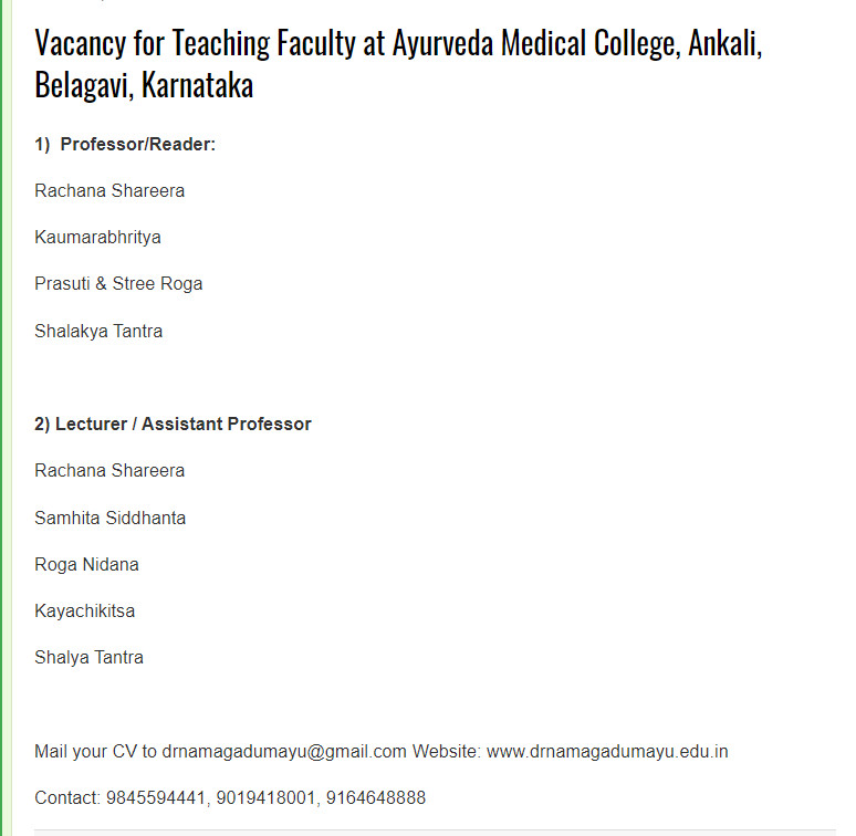 Vacancy for the post of Teaching Faculty at Ayurveda Medical College, Belagavi.