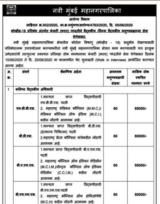 Walk-in Interview for Various Posts at Navi Mumbai Municipal Corporation.