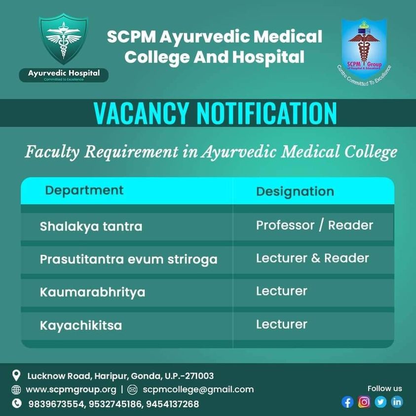 Vacancy For Reader, Lecturer & Professor At SCPM Ayurvedic Medical College