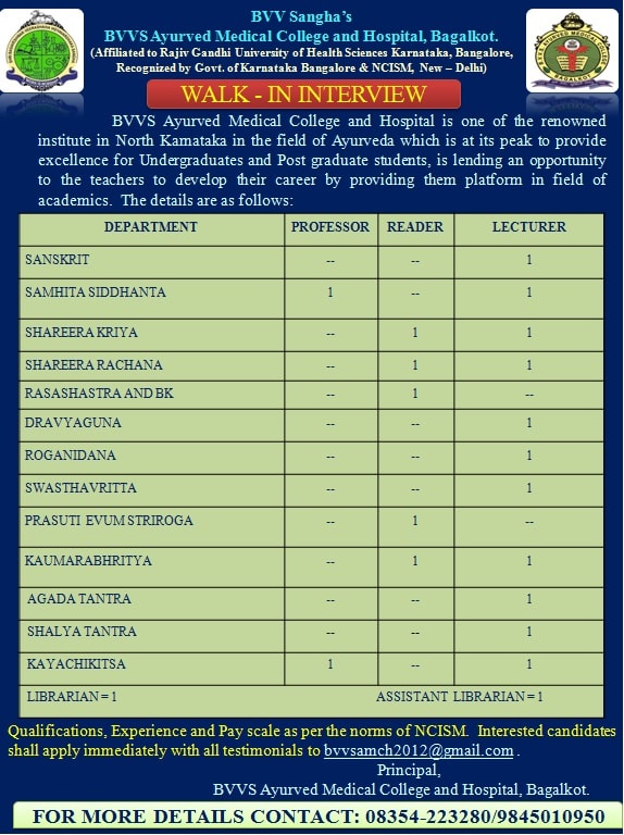Vacancy For Various Posts At BVVS Ayurveda Medical College