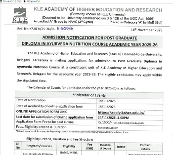 Admission Notice for PG Diploma in Ayurveda Nutrition Course,