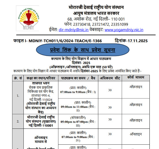 Admission Notice for Foundation Course in Yoga Science for Wellness, Morarji Desai National Institute of Yoga, New Delhi.