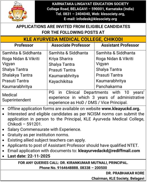 KLE Ayurveda Medical College Chikodi Recruitment 2025 - Teaching Faculty Jobs in Karnataka