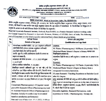 Walk-in Interview for the various posts of Consultant, Regional Ayurveda Research Institute, Pune.
