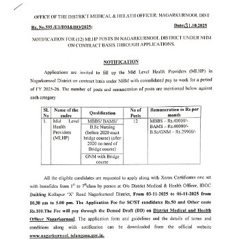 Vacancy for the post of Mid Level Health Providers (MLHP), National Health Mission, Nagarkurnool.