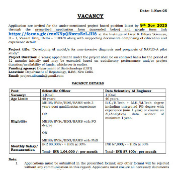 Vacancy for the post of Scientific Officer, Institute of Liver & Biliary Sciences, Delhi.