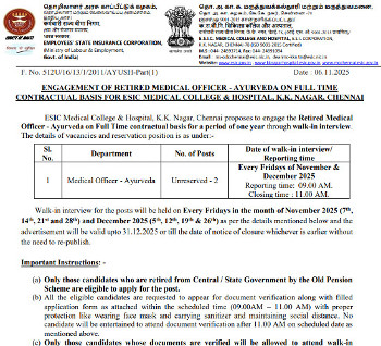 Walk-in Interview for the post of Medical Officer (Ayurveda), Employees State Insurance Corporation, Chennai.