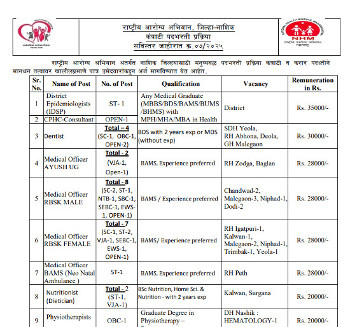 Vacancy for the posts of District Epidemiologists & Medical Officers, National Health Mission, Nashik.