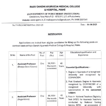 Vacancy for the posts of Assistant Professors, Rajiv Gandhi Ayurveda Medical College & Hospital, Mahe.