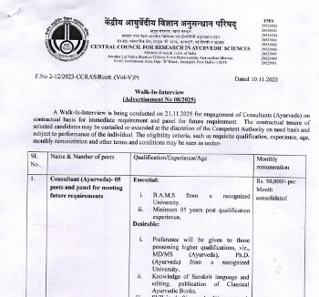 Walk-in Interview for the posts of Consultant (Ayurveda), Central Council for Research in Ayurvedic Sciences, New Delhi.
