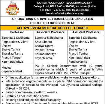 Vacancy for the posts of Teaching Faculty, KLE Ayurveda Medical College, Chikodi.