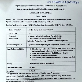 Vacancy for the post of NMHS Survey Field Data Collector, Postgraduate Institute of Medical Education & Research, Chandigarh.
