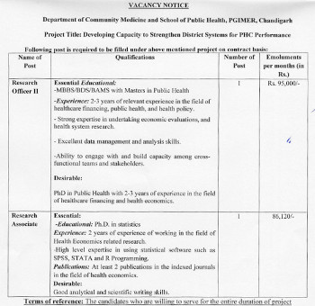 Vacancy for the post of Research Officer II, Postgraduate Institute of Medical Education & Research, Chandigarh.