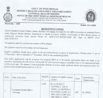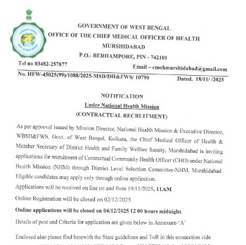 Vacancy for the post of Community Health Officer, District Health and Family Welfare Samity, Murshidabad.