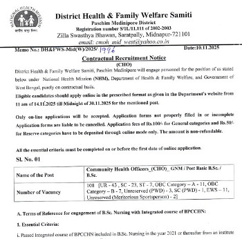 Vacancy for the post of Community Health Officer, District Health & Family Welfare Samiti, Midnapur.