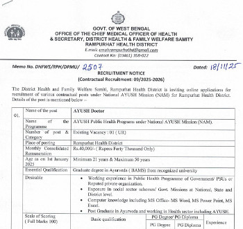Vacancy for the post of AYUSH Doctor (Ayurveda), District Health and Family Welfare Samiti, Rampurhat.