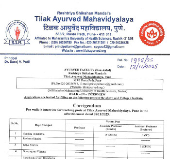 Walk-in Interview for the post of Ayurved Faculty, Tilak Ayurved Mahavidyalaya, Pune.
