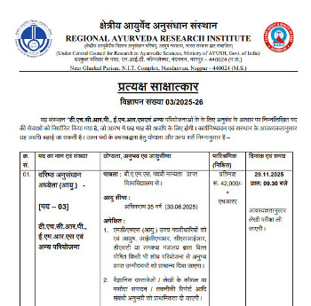 Walk-in Interview for the post of Senior Research Fellow (Ayu.), Regional Ayurveda Research Institute, Nagpur.