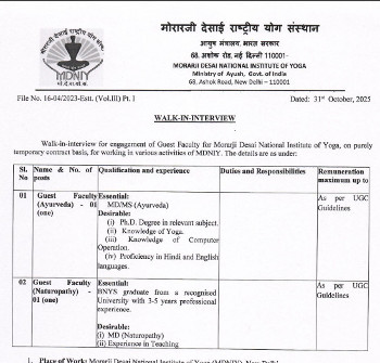 Walk-in Interview for the post of Guest Faculty (Ayurveda), Morarji Desai National Institute of Yoga, New Delhi.