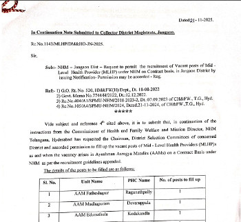 Vacancy for the post of Mid Level Health Provider (MLHP), National Health Mission, Jangaon.