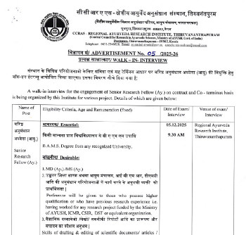 Walk-in Interview for the post of Senior Research Fellow (Ay.), Regional Ayurveda Research Institute, Thiruvananthapuram.