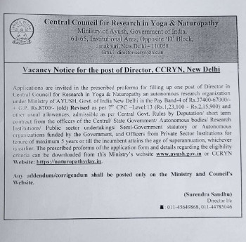 Vacancy for the post of Director, Central Council for Research in Yoga & Naturopathy, New Delhi.