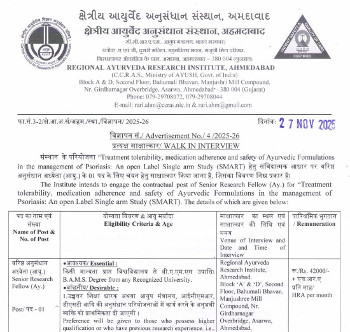 Walk-in Interview for the post of Senior Research Fellow (Ay.) (SMART), Regional Ayurveda Research Institute, Ahmedabad.