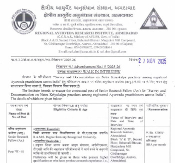 Walk-in Interview for the post of Senior Research Fellow (Ay.) (Netra Kriyakalpa), Regional Ayurveda Research Institute, Ahmedabad.