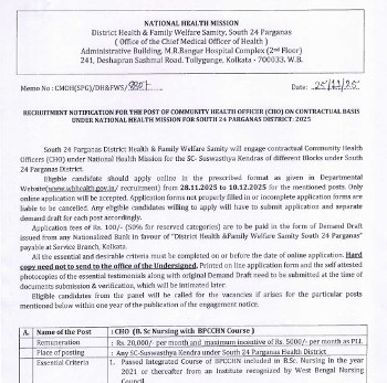 Vacancy for the post of Community Health Officer (CHO), National Health Mission, South 24 Parganas.