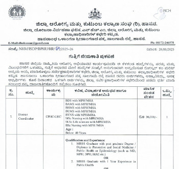 Vacancy for the post of District Coordinator, National Health Mission, Hassan.