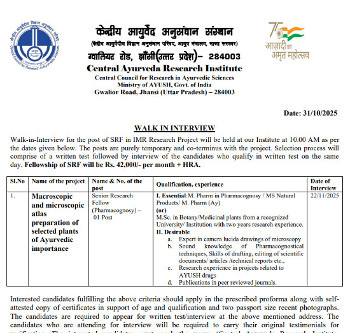 Walk-in Interview for the post of Senior Research Fellow, Central Ayurveda Research Institute, Jhansi.