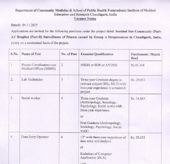 Job Code : 3 Vacancy for the post of Project Coordinators cum Medical Officer (AYUSH), Postgraduate Institute of Medical Education & Research, Chandigarh.
