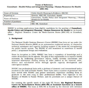 Job Code : 4 Vacancy for the post of Consultant - Health Policy and Integrated Planning/Human Resource for Health (AYUSH), National Health Systems Resource Centre.