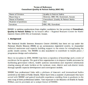 Job Code : 5 Vacancy for the post of Consultant-Quality & Patient Safety (AYUSH), National Health Systems Resource Centre.