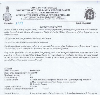 Job Code : 6 Vacancy for the post of Facility Consultant Quality Monitoring (AYUSH), National Health Mission, Bankura.