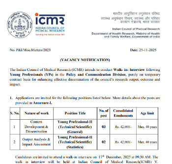 Job Code : 8 Walk-in Interview for the post of Young Professionals (AYUSH), Indian Council of Medical Research, New Delhi.