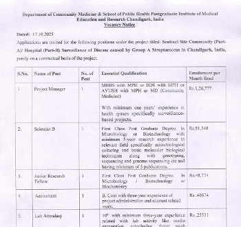 Job Code : 11 Vacancy for the post of Project Manager, Postgraduate Institute of Medical Education & Research, Chandigarh.
